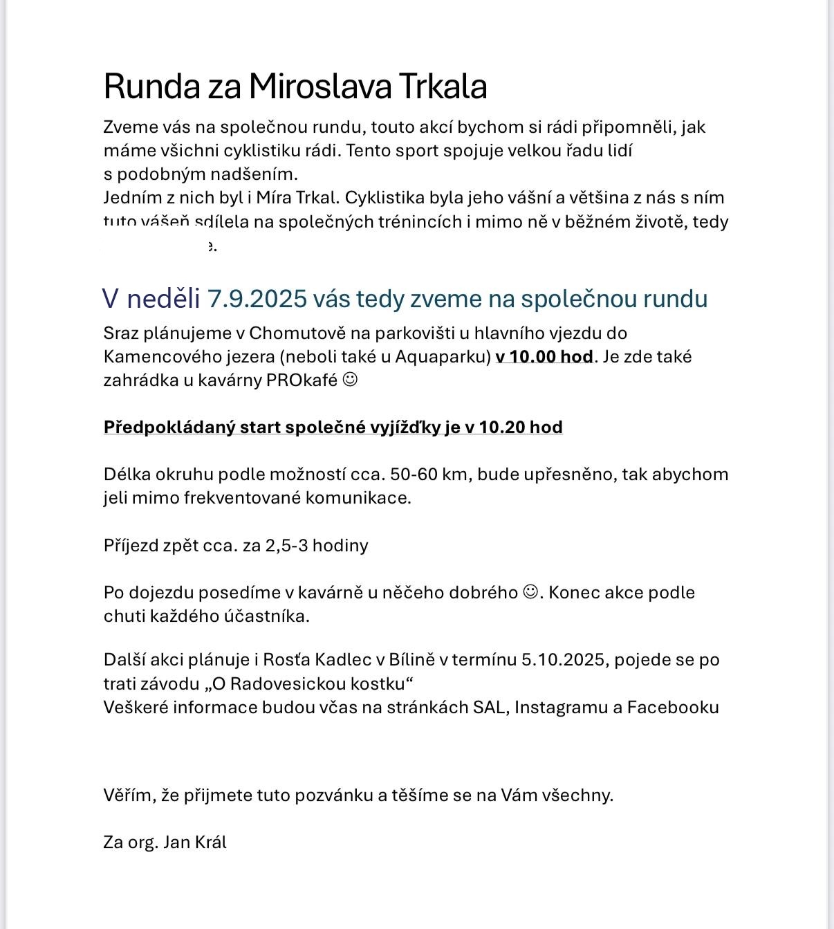 Na neděli 7. září 2025 připravují kluci z Chomutova vyjížďku k uctění památky na kamaráda Míru Trkala, viz úvodní foto.